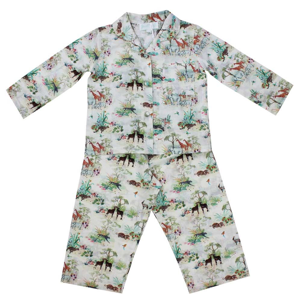 Traditional style cotton pyjamas with a vintage-inspired print of African animals. This busy savanna scene has elephants, jaguars, zebras, giraffes, parrots, and acacia trees in muted tones against a white background. The long-sleeved jacket features fabric-covered buttons and the pyjama trousers have a drawstring waist for comfort.